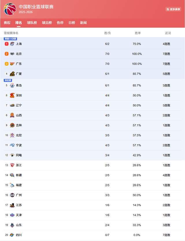 CBA常规赛第8轮火热进行中,随着2场比赛战罢,积分榜格局再起波澜。上海男篮凭借客场90-70大胜北控的强势表现,以6胜2负的战绩暂居榜首,这是谁都没有想到的结果,当然,这一位置恐将因后续强队交锋而变动。四冠王辽宁男篮客场90-93惜败深圳,一波3连败之后,以4胜4负跌至第七,而深圳男篮凭借这场胜利升至第六。目前,广东男篮和北京首钢仍以7胜0负保持不败,成为本赛季冲冠的头号热门。上海男篮对阵北控,可以说没啥悬念,此役他们展现出了恐怖的统治力,半场便建立20分优势,最终篮板球狂胜对手18个。首发五虎全部得分上双,外援洛夫顿与本土核心张镇麟状态回暖,成为赢球关键。随着此役取胜,上海男篮6胜2负,暂时来到积分榜首位,这恐怕是超乎了所有人的预料了。不过,随着第8轮其他强队陆续出战,上海队的榜首位置恐将让位于广东男篮、北京首钢等劲旅。辽宁男篮客场挑战深圳,因外援威尔斯缺阵,阵容深度大打折扣。虽然布朗、付豪延续高效表现,鄢手骐和王岚嵚也分别贡献15分和12分,但球队仍未能抵挡住深圳的攻势。深圳本土核心贺希宁此役18投11中,砍下29分6篮板6助攻,休赛期赴美特训的效果显著,已跻身本土顶级得分手行列。辽宁队最后时刻连续错失逆转良机,暴露出关键球处理能力的不足。随着此役落败,辽宁男篮吞下3连败,战绩也变成4胜4负,排名继续下滑,已经掉出前6名,直接来到第7位。目前积分榜前六中,浙江广厦、北京首钢、广东男篮被视为真正的争冠热门。广厦虽爆冷负于辽宁,但整体实力仍属顶级;北京首钢和广东男篮均以7胜0负领跑,且尚未集结最强阵容——北京队的曾凡博仍未登场,广东队的崔永熙和麦考尔尚未回归。若这两支球队完成阵容磨合,CBA格局恐将迎来新一轮洗牌。随着常规赛深入,上海、辽宁、广东、北京、广厦等队的直接交锋将成为决定排名的关键。上海队需保持团队稳定性,辽宁队则需尽快解决外援依赖问题,而广东和北京若能在后续比赛中展现统治力,或将提前锁定季后赛优势。本赛季CBA的争冠之路,注定充满变数与惊喜。至于说黑马青岛男篮,能延续到什么时候,还有待进一步考察,毕竟少了杨瀚森,刘维伟的队伍还是要差点意思的。
